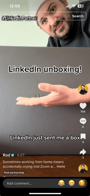 Rod Thill brings workplace humor and millennial anxiety to life in short-form formats—sharp sketches set to punchy text overlays and familiar beats of corporate culture. His characters and recurring themes build familiarity. When a brand weaves its way into these relatable setups, it shows up in the world he’s already built.