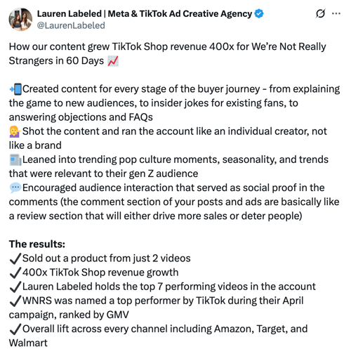 Lauren, founder of Lauren Labeled, a Meta and TikTok ad creative agency, demonstrated the power of this approach by growing TikTok Shop revenue 400x for We're Not Really Strangers in just 60 days.