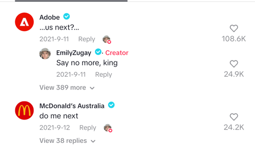 This series became so popular, dozens of large brands started commenting and engaging. Many even giving her permission to use their logo in the next video: